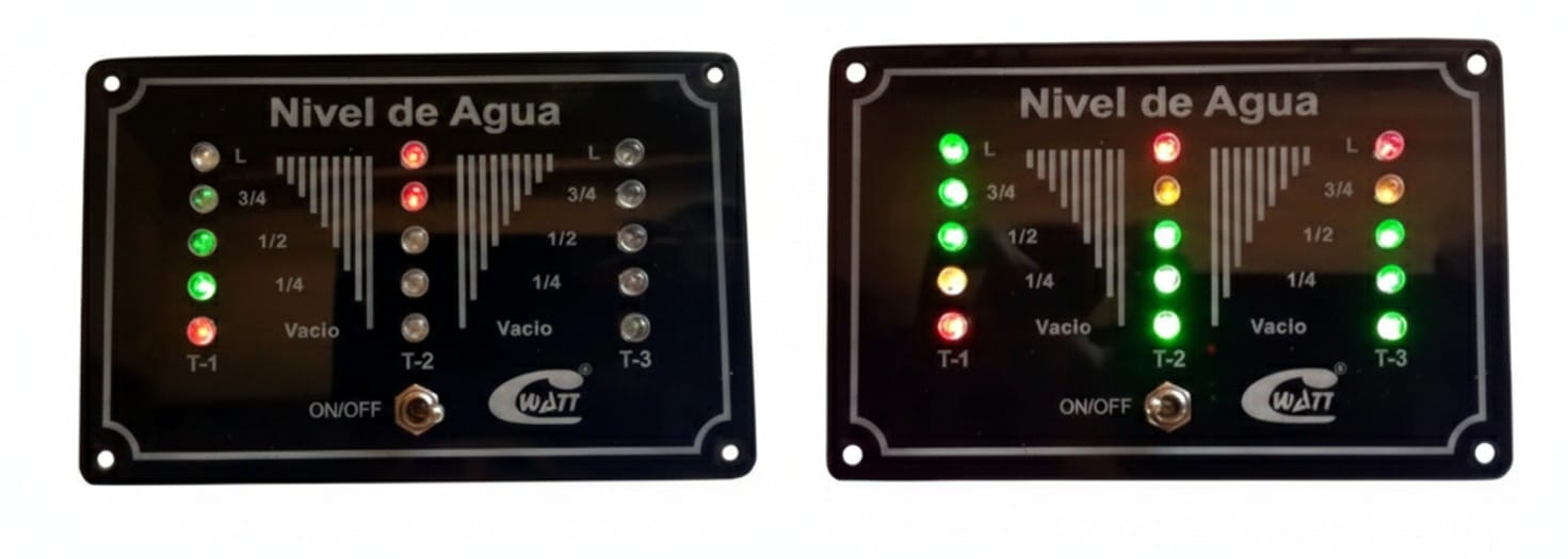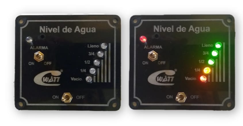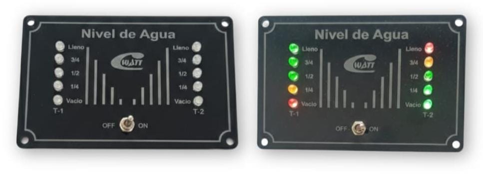 5 Leds indican el nivel del Tanque Tensión de Alimentación: 12 Vcc (Otras Tensiones Consultar) Para cualquier tipo de Agua (Potables, Servidas, etc.) Indicador tipo tablero o en gabinete PVC